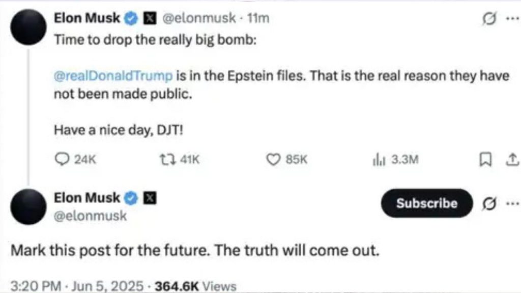 गुरुवार को एलन मस्क ने कहा था कि जल्द ही बहुत बड़ा खुलासा करूंगा. उन्होंने सोशल मीडिया प्लेटफॉर्म एक्स पर ट्वीट करते हुए लिखा था, ‘अब बड़ा खुलासा करने का टाइम है. डोनाल्ड ट्रम्प का नाम एपस्टीन की फाइलों में हैं. यही कारण है कि इन्हें सार्वजनिक नहीं किया गया. डोनाल्ड ट्रम्प, आपका दिन शुभ हो.’