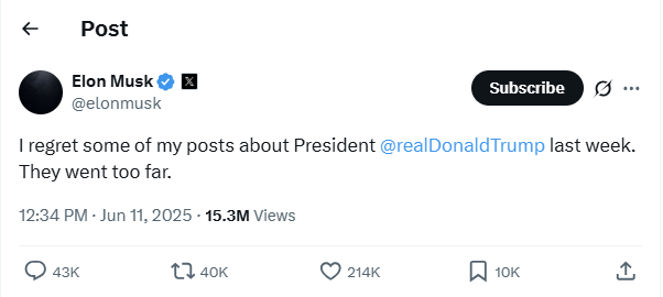 ऐसे में मस्क द्वारा किए गए नए पोस्ट ने इस विवाद को कुछ हद तक शांत कर दिया है. इसके साथ ही उन्होंने डोनाल्ड ट्रंप के बारे में अपने कुछ भड़काऊ सोशल मीडिया पोस्ट हटा भी दिए हैं. राष्ट्रपति अभी भी सुलह के मूड में नहीं दिख रहे हैं और उन्होंने मस्क को चेतावनी दी है कि अगर उन्होंने 2026 के मध्यावधि चुनावों में डेमोक्रेट्स का समर्थन किया तो उन्हें ‘बहुत गंभीर परिणाम’ भुगतने होंगे.