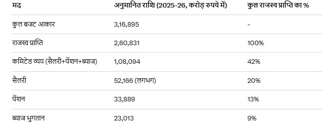बिहार सरकार ने 3 मार्च 2025 को वित्तीय वर्ष 2025-26 के लिए 3,16,895 करोड़ रुपये का बजट पेश किया, जो पिछले साल के 2,78,726 करोड़ से 13.69% ज्यादा है. इस बजट में बिहार सरकार ने शिक्षा के लिए 60,954 करोड़, स्वास्थ्य के लिए 20,335 करोड़, ग्रामीण विकास के लिए 16,193 करोड़ और ऊर्जा 13,483 करोड़ रुपये का प्रावधान किया था. लेकिन कुल व्यय का 79.52% ,लगभग 2.52 लाख करोड़ राजस्व व्यय पर है, जिसमें सैलरी, पेंशन और ब्याज भुगतान जैसे ‘कमिटेड एक्सपेंडीचर’ शामिल हैं.