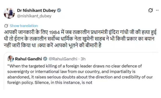 राहुल गांधी के इस पोस्ट पर भाजपा सांसद निशिकांत दुबे ने जवाब दिया. उन्होंने अपनी पोस्ट में लिखा कि ‘आपकी जानकारी के लिए 1984 में जब तत्कालीन प्रधानमंत्री इंदिरा गांधी जी की हत्या हुई थी तो ईरान के तत्कालीन सर्वोच्च धार्मिक नेता खुमेनी साहब ने भी किसी प्रकार का बयान नहीं जारी किया था. क्या करें आपको भूलने की बीमारी है.’