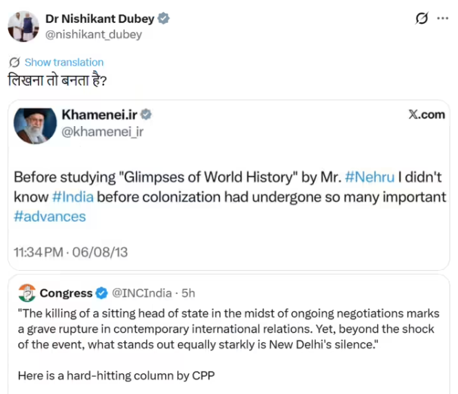 सोनिया गांधी के इस लेख पर भाजपा ने पटलवार करते हुए जवाब दिया है.बीजेपी सांसद निशिकांत दुबे ने सोनिया गांधी के लेख पर जवाब देते हुए खामेनेई की एक पुरानी पोस्ट शेयर की है और कहा कि ‘लिखना तो बनता है.’ खामेनेई की इस पोस्ट में उन्होंने लिखा कि नेहरू की ओर लिखी गई ‘ग्लिम्प्स ऑफ वर्ल्ड हिस्ट्री’ का अध्ययन करने से पहले मुझे यह नहीं पता था कि उपनिवेशीकरण से पहले भारत ने इतनी महत्वपूर्ण प्रगति की थी, खामेनेई ने ये पोस्ट 6 अगस्त 2013 में किया था. इसी पोस्ट का स्क्रीनशॉट शेयर करते हुए निशिकांत दुबे ने बस इतना ही कहा कि ‘लिखना तो बनता है?’