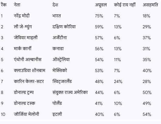 पिछले साल ही भारी बहुमत से दोबारा सत्ता में आए अमेरिकी राष्ट्रपति डोनाल्ड ट्रम्प, इस लिस्ट में टॉप 5 में भी जगह नहीं बना पाए. वह 44% अप्रूवल के साथ आठवें नंबर पर हैं. ऐसा माना जा रहा है कि उनकी कुछ नीतियों, जैसे व्यापार शुल्क और घरेलू फैसलों के कारण उनकी लोकप्रियता थोड़ी कम हुई है.