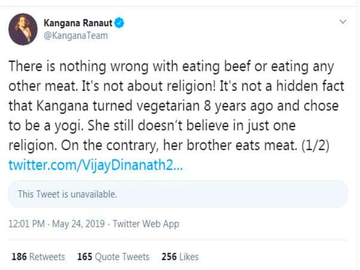 दरअसल, कंगना ने 24 मई 2019 को सोशल मीडिया पर एक पोस्ट की थी. इसमें उन्होंने कहा था,’बीफ या दूसरा कोई भी मांस खाने में कोई बुराई नहीं है. यह धर्म के बारे में नहीं है! यह किसी से छिपा नहीं है कि 8 साल पहले मैंने शाकाहार को अपनाकर एक योगी का रास्ता चुना था. मैं सिर्फ एक धर्म में विश्वास नहीं करती हूं.’ उन्होंने आगे कहा था कि इसके ठीक विपरीत मेरा भाई मांस खाता है.