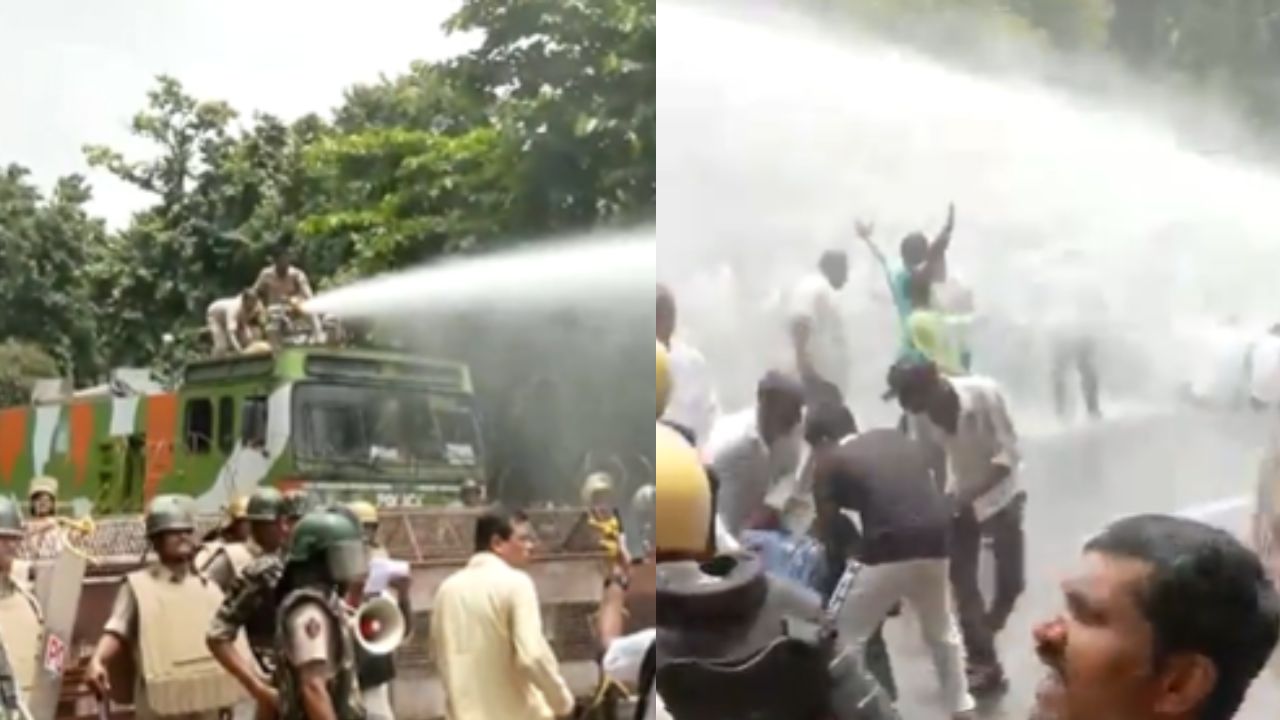 #WATCH | Bhubaneswar, Odisha | Police use water cannon to disperse BJD workers protesting over Balasore student's death by self-immolation.