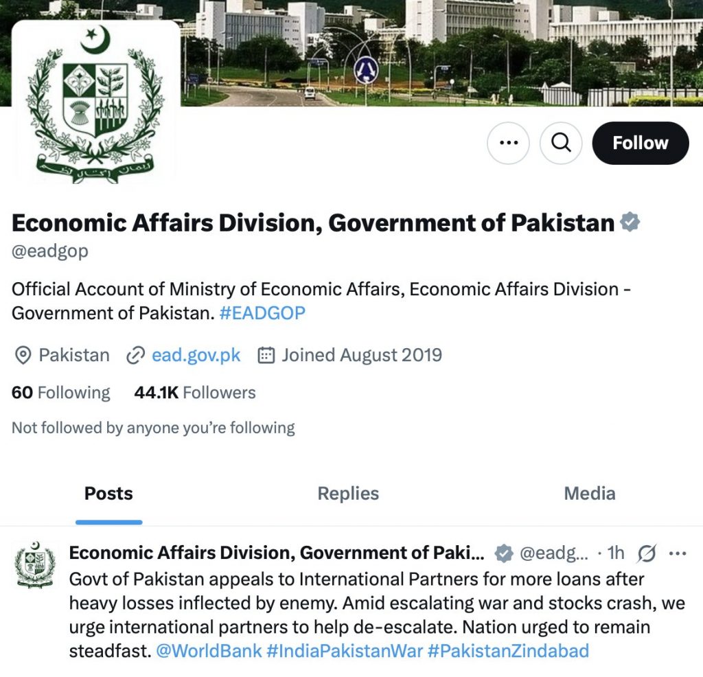 पाकिस्तान सरकार के इस एक्स हैंडल से लिखा गया, “पाकिस्तान सरकार ने दुश्मन द्वारा भारी नुकसान के बाद अंतरराष्ट्रीय साझेदारों से और अधिक लोन की अपील की है. बढ़ते युद्ध और शेयरों में गिरावट के बीच, हम अंतरराष्ट्रीय साझेदारों से तनाव कम करने में मदद करने का अनुरोध करते हैं.” इस पोस्ट के वायरल होने के बाद पाकिस्तान की फजीहत होने लगी तो सरकार की तरफ से कहा गया है कि उनका एक्स हैंडल हैक हो गया है.