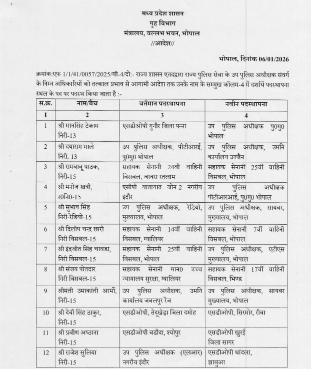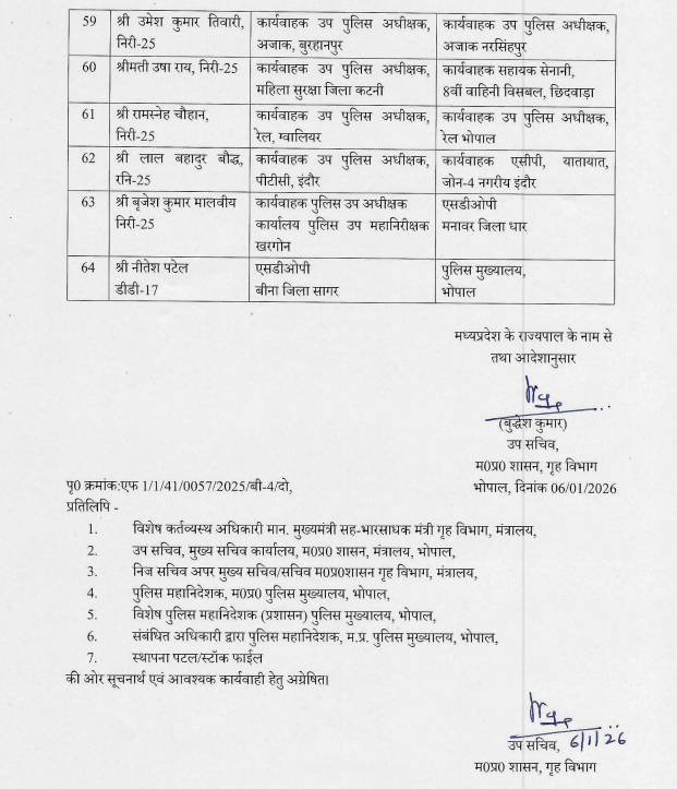 MP DSP Transfer: भोपाल समेत प्रदेश के 64 DSP के ट्रांसफर, गृह विभाग ने जारी किया आदेश