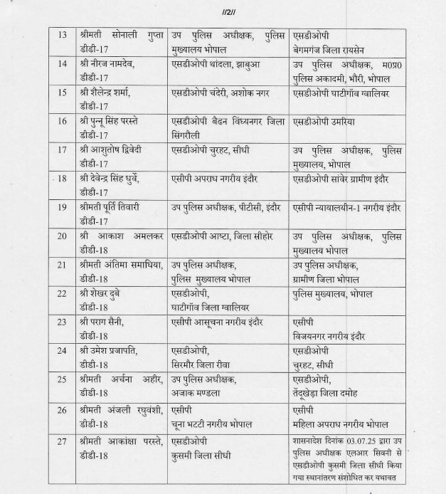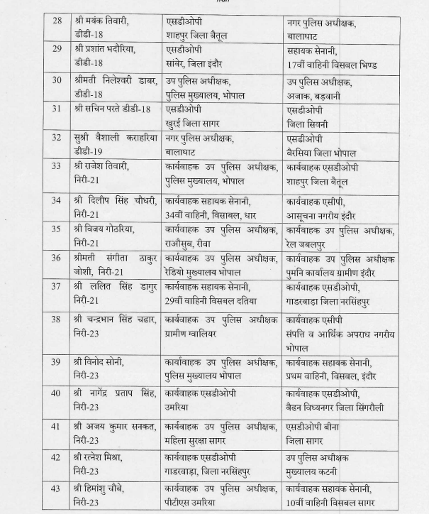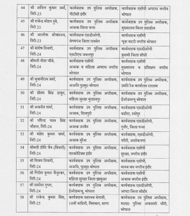मध्य प्रदेश में राजधानी भोपाल समेत पूरे राज्य में डीएसपी लेवल के अधिकारियों के ट्रांसफर किए गए हैं.