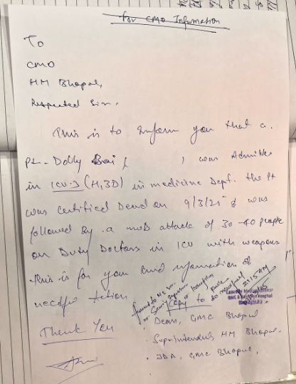 इस घटना के बाद डॉक्टर्स ने सीएमओ को पत्र लिखकर घटना की जानकारी दी. उन्होंने लिखा कि 9 मार्च को डोली बाई नाम के मरीज को मृत घोषित किया गया था. इसके बाद 30-40 लोग आईसीयू वार्ड में आए और जूनियर डॉक्टर्स के साथ मारपीट की.