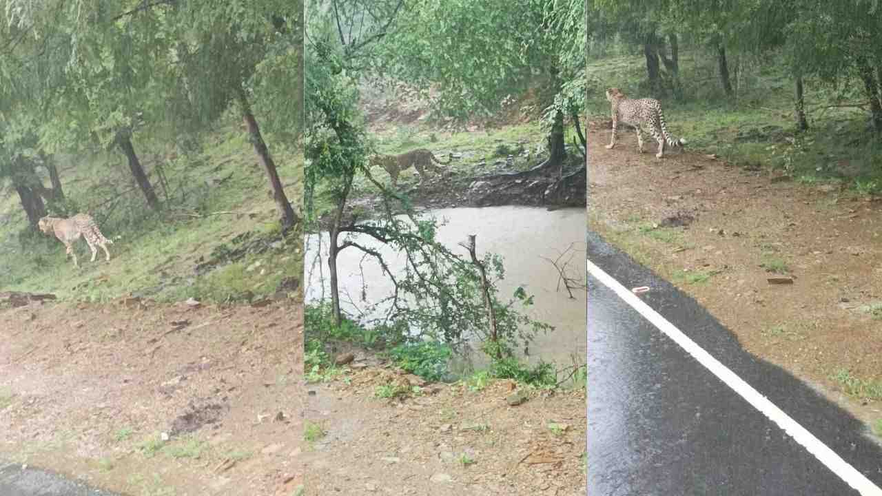कूनो नेशनल पार्क से निकलकर चीतों का समूह बारिश के बीच सड़क पर टहलते नजर आया.