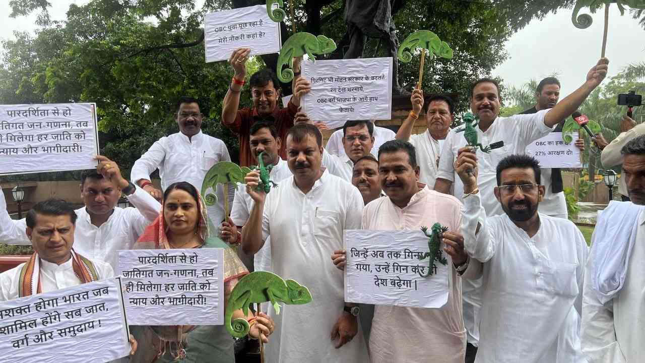 MP Assembly Monsoon Session: मध्य प्रदेश विधानसभा के मानसून सत्र का आज पहला दिन है. लेकिन सत्र के पहले ही दिन कांग्रेस ने विधानसभा के बाहर जमकर प्रदर्शन किया. नेता प्रतिपक्ष उमंग सिंघार समेत कांग्रेस विधायक प्रतीकात्मक रुप से गिरगिट(गिरगिट के खिलौने) लेकर पहुंचे. कांग्रेस विधायकों ने कहा कि OBC आरक्षण को लेकर सरकार गिरगिट की तरह रंग बदल रही है. सरकार अन्य पिछड़ा वर्ग को 27 परसेंट का आरक्षण नहीं देना चाहती है.