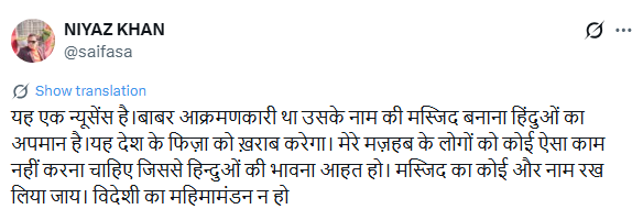 सोशल मीडिया पोस्ट में आईएएस ने आगे लिखा कि यह देश के फिजा को खराब करेगा. मेरे मजहब के लोगों को कोई ऐसा काम नहीं करना चाहिए, जिससे हिन्दुओं की भावना आहत हो. मस्जिद का कोई और नाम रख लिया जाए. विदेशी का महिमामंडन न हो.