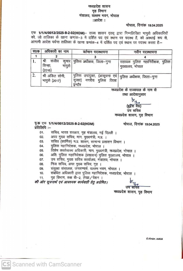 शनिवार यानी 19 अप्रैल को देर रात गृह विभाग की ओर से ट्रांसफर ऑर्डर जारी किया गया. इसमें संजीव कुमार सिन्हा का ट्रांसफर करके उन्हें भोपाल स्थित पुलिस मुख्यालय में पुलिस महानिरीक्षक के पद पर तैनात कर दिया गया है.