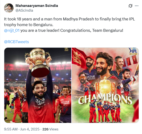 Mahanaryaman Scindia congratulated RCB on winning the IPL 2025 title