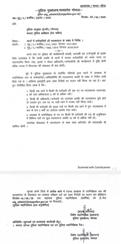 -किसी भी अधिकारी/कर्मचारी को उपरोक्त अवधि की पदस्थापना पूर्ण होने के उपरांत पुनः उस पद पर उसी थाने में पदस्थ नहीं किया जाए.