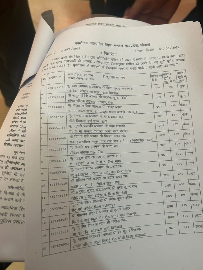 ये भी पढ़ें: MP Board Result घोषित, 10वीं में प्रज्ञा जायसवाल ने मारी बाजी, 12वीं में प्रियल द्विवेदी ने किया टॉप