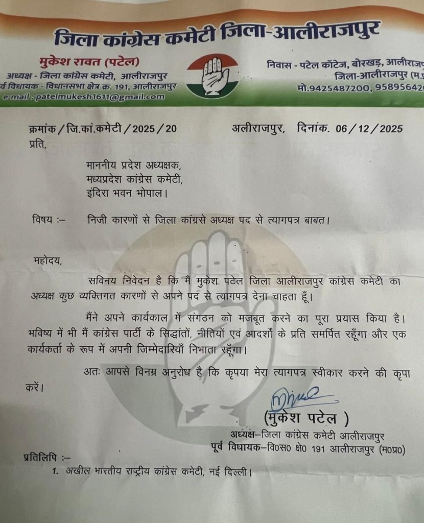 MP News: मध्य प्रदेश कांग्रेस के लिए शनिवार का दिन एक बड़े राजनीतिक बदलाव का गवाह बना, जब आलीराजपुर जिला कांग्रेस कमेटी के अध्यक्ष और पूर्व विधायक मुकेश रावत (पटेल) ने अपने पद से इस्तीफ़ा देकर सभी को हैरान कर दिया. उन्होंने अपना त्यागपत्र प्रदेश कांग्रेस अध्यक्ष को भेजते हुए उसकी प्रति एआईसीसी, नई दिल्ली तक भी पहुंचाई, जिससे यह कदम औपचारिक रूप से पार्टी नेतृत्व तक दर्ज हो गया है.