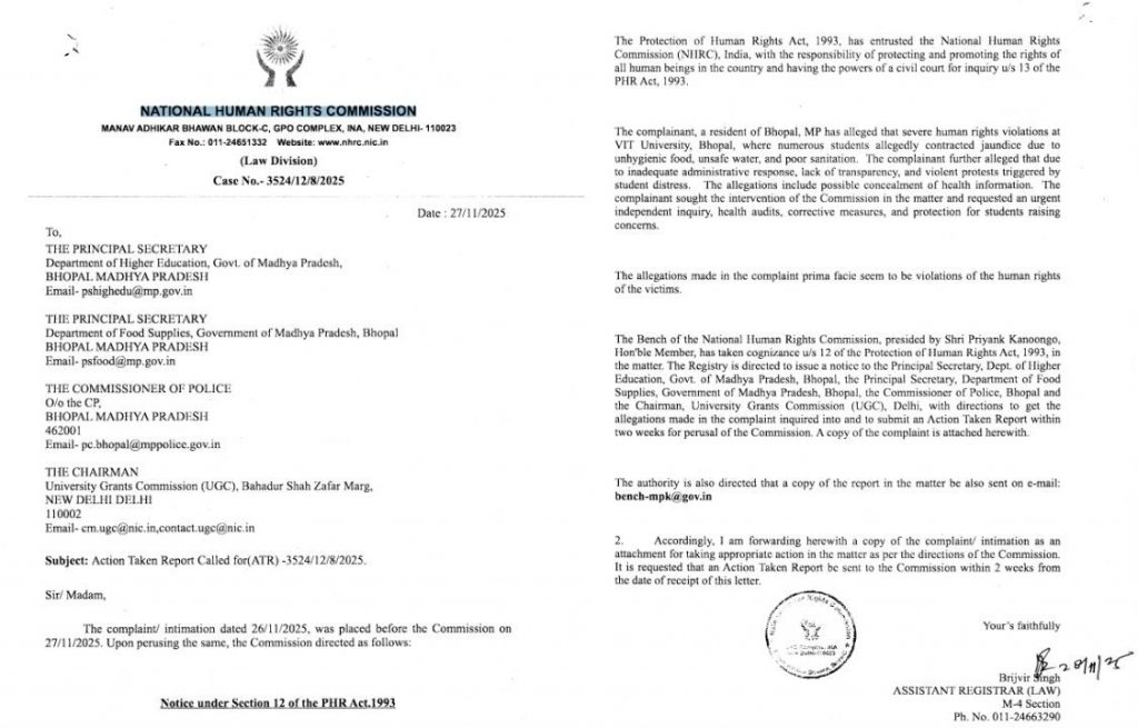 इस पूरे मामले में राष्ट्रीय मानवाधिकार आयोग ने भी गंभीरता से संज्ञान लिया है. आयोग ने यूनिवर्सिटी और सरकार के उच्च शिक्षा विभाग को नोटिस जारी करते हुए आवश्यक कार्रवाई के निर्देश दिए हैं. नोटिस के अनुसार, भोपाल निवासी एक शिकायतकर्ता ने आरोप लगाया है कि VIT यूनिवर्सिटी, भोपाल में मानवाधिकारों का गंभीर उल्लंघन हुआ है, जहां खराब खाने, असुरक्षित पानी और गंदगी के कारण कई छात्रों को पीलिया हो गया. शिकायत में यह भी कहा गया है कि प्रशासनिक कार्रवाई में लापरवाही और पारदर्शिता की कमी के चलते छात्रों का विरोध हिंसक रूप ले गया. इसके साथ ही हेल्थ डाटा छिपाने की आशंका भी जताई गई है. शिकायतकर्ता ने आयोग से स्वतंत्र जांच, स्वास्थ्य ऑडिट और छात्रों की सुरक्षा सुनिश्चित करने की मांग की है. आयोग का कहना है कि लगाए गए आरोप प्रथम दृष्टया मानवाधिकार उल्लंघन को दर्शाते हैं.