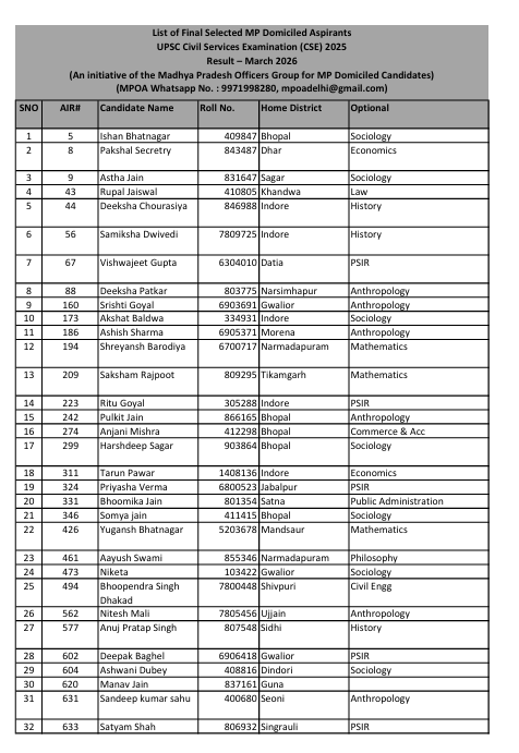 UPSC Result 2025: एमपी के 43 होनहारों ने फरहाया परचम! भोपाल के ईशान भटनागर को मिली 5वीं रैंक, देखें टॉपर्स की पूरी लिस्ट