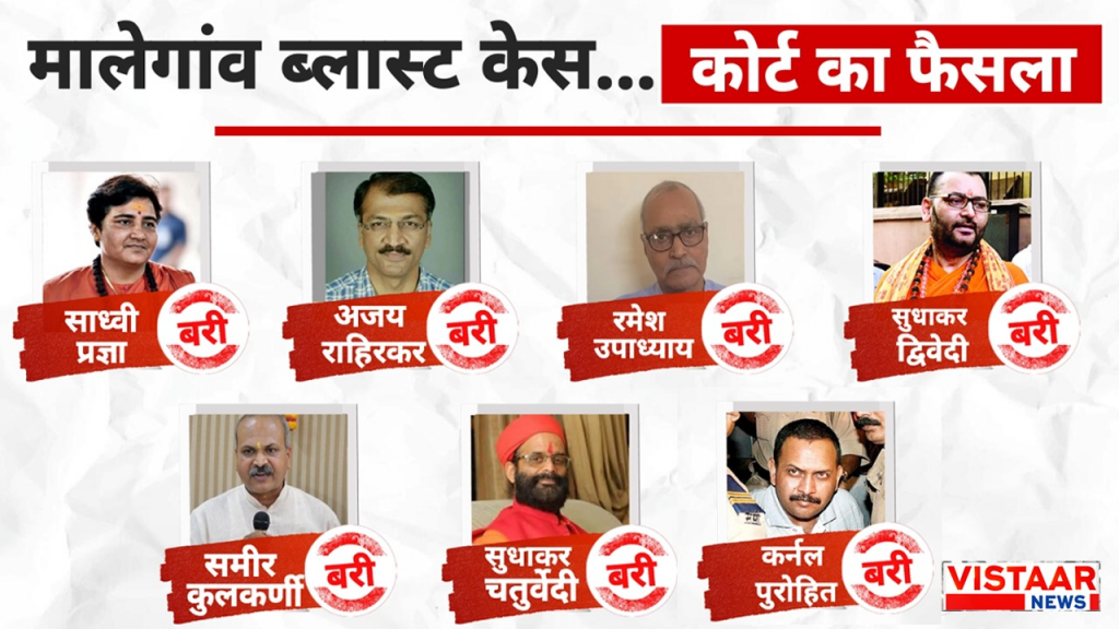 मुंबई की एक विशेष राष्ट्रीय जांच एजेंसी (NIA) कोर्ट ने 2008 के मालेगांव बम विस्फोट (Malegaon Blast Case) मामले में सभी सात आरोपियों को बरी कर दिया है. यह फैसला 17 साल के लंबे मुकदमे के बाद आया है. बरी होने वालों में पूर्व बीजेपी सांसद साध्वी प्रज्ञा सिंह ठाकुर, लेफ्टिनेंट कर्नल प्रसाद श्रीकांत पुरोहित (सेवानिवृत्त), मेजर रमेश उपाध्याय (सेवानिवृत्त), समीर कुलकर्णी, अजय राहिरकर, सुधाकर धर द्विवेदी और सुधाकर चतुर्वेदी शामिल हैं.