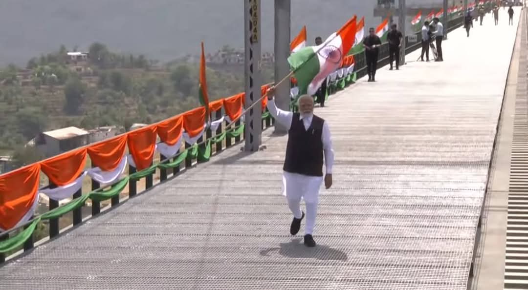 इस दौरान PM मोदी हाथ में तिरंगा लेकर चिनाब ब्रिज पर चलते हुए नजर आए.
