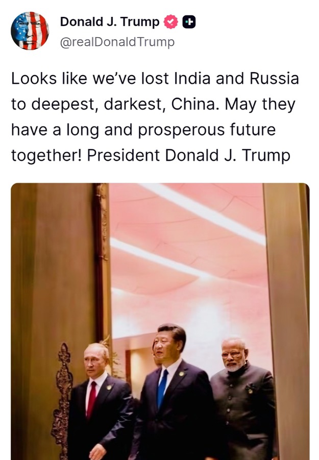 अपने ट्रुथ सोशल मीडिया पोस्ट पर डोनाल्ड ट्रंप ने पोस्ट करते हुए लिखा, “लगता है हमने भारत और रूस को खतरनाक चीन के हाथों खो दिया है.” ट्रंप ने साथ ही उम्मीद जताई है कि उनका साथ लंबा और समृद्ध हो. इस पोस्ट के साथ ही ट्रंप ने चीनी राष्ट्रपति जिनपिंग, रूसी राष्ट्रपति पुतिन और पीएम नरेंद्र मोदी की तस्वीर शेयर की है.